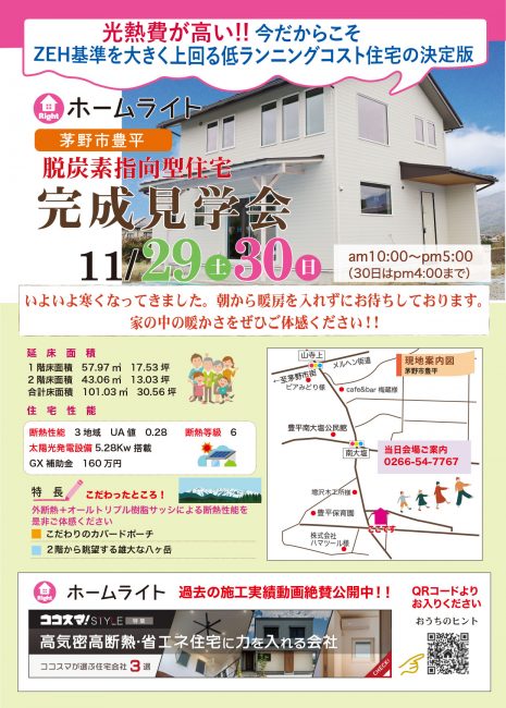 11月29日(土)30日(日)茅野市豊平で完成見学会を開催いたします。 お知らせ | 見学会のご案内 2025年11月6日 11月29日(土)30日(日)茅野市豊平で完成見学会を開催いたします。お気軽にお越しください!