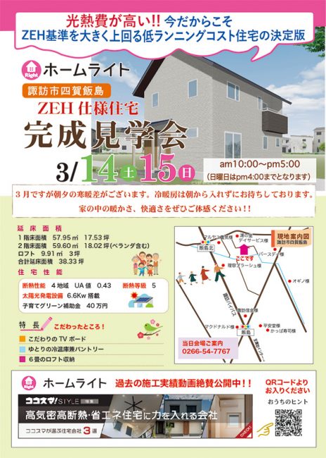 3月14日(土)15日(日)諏訪市四賀飯島で完成見学会を開催いたします。 お知らせ 2026年2月19日 3月14日(土)15日(日)諏訪市四賀飯島で完成見学会を開催いたします。 ぜひお気軽にお越しください。