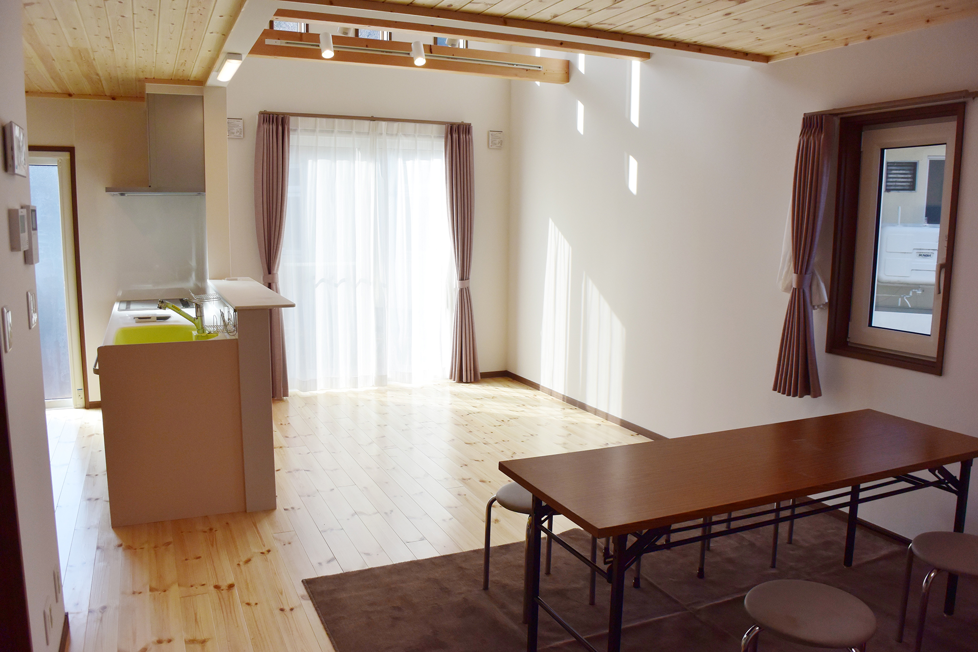 ■建材に無垢パインフローリング、パイン羽目板を使用し、屋内壁はアクリルエマルジョンペイントを使用し塗装を施した暖かな内観